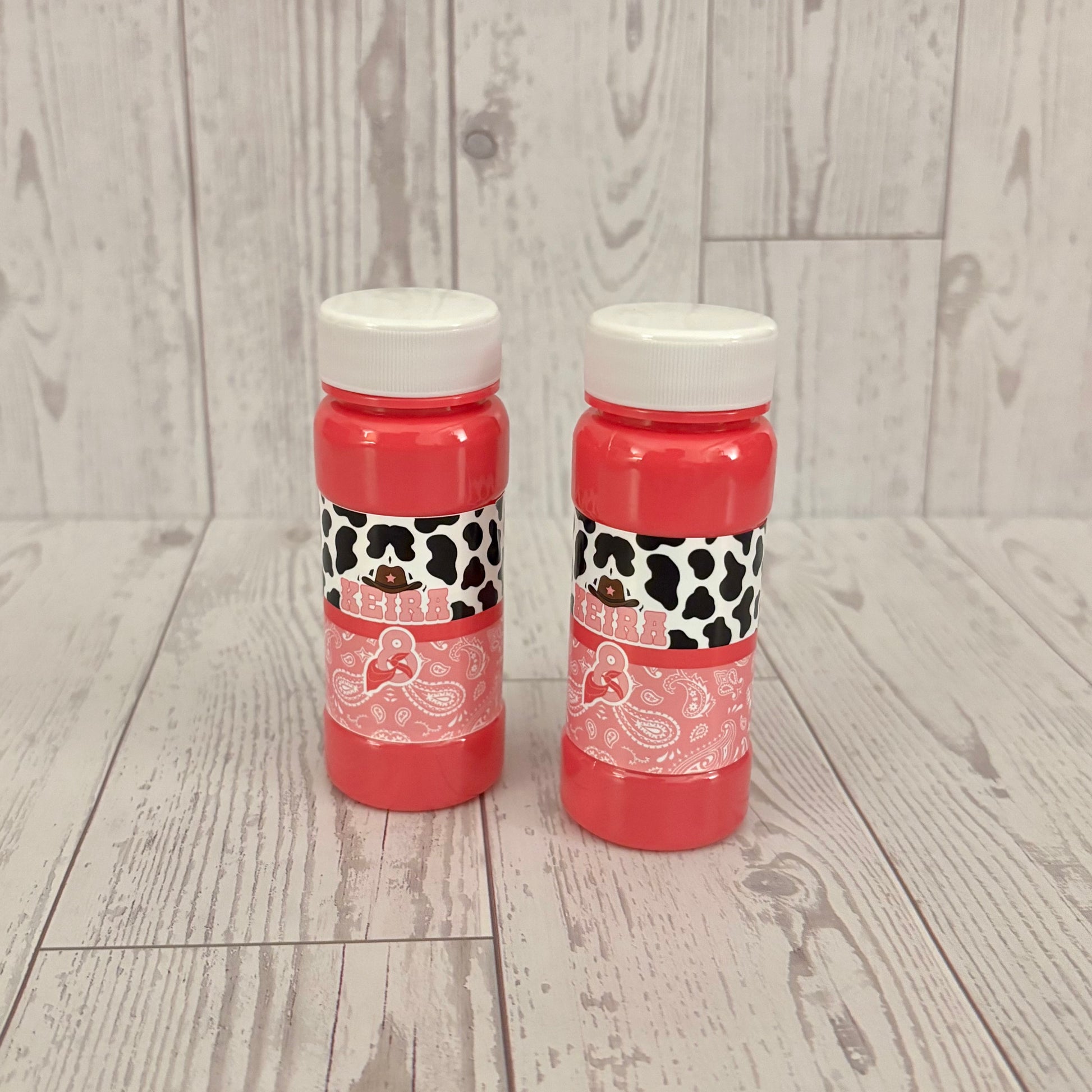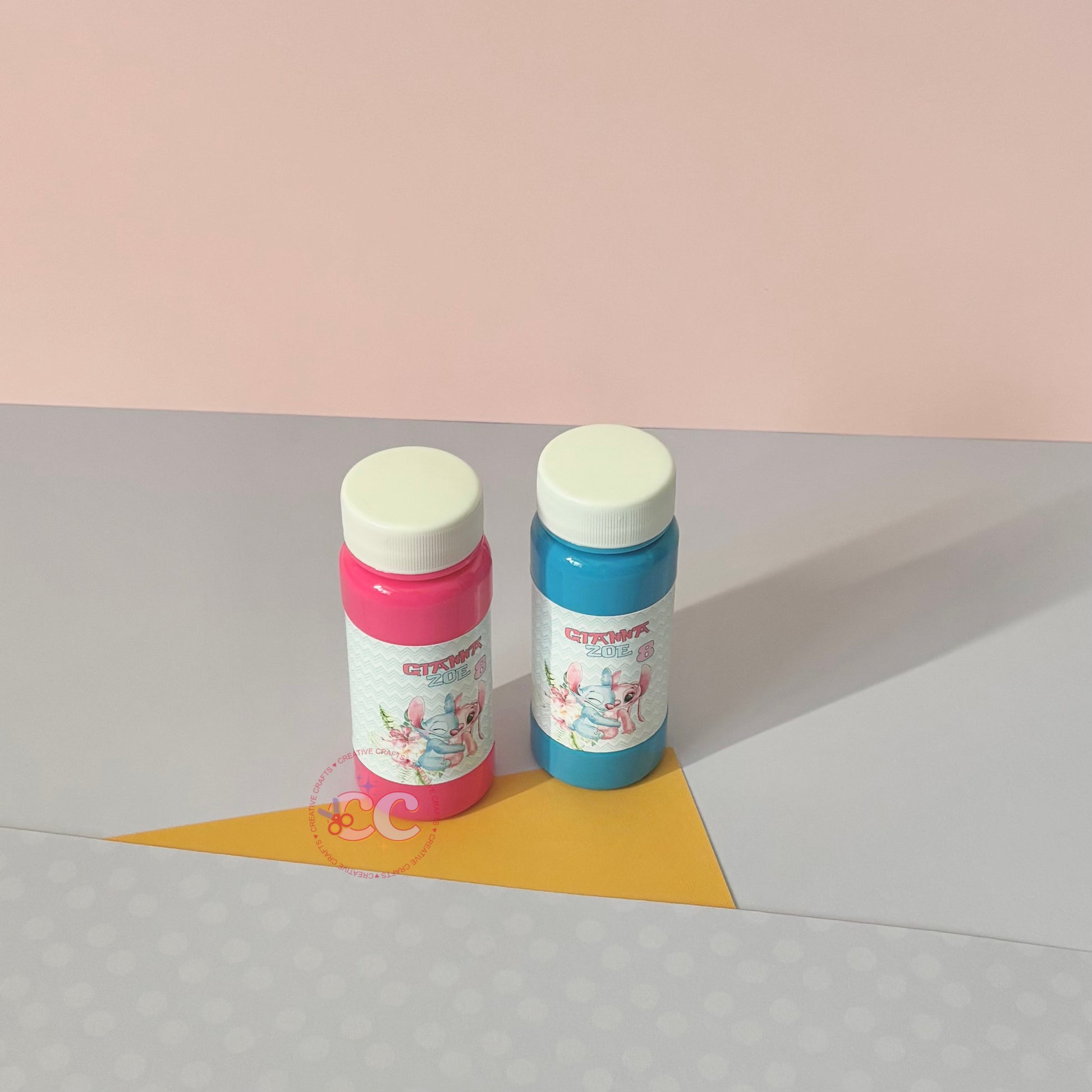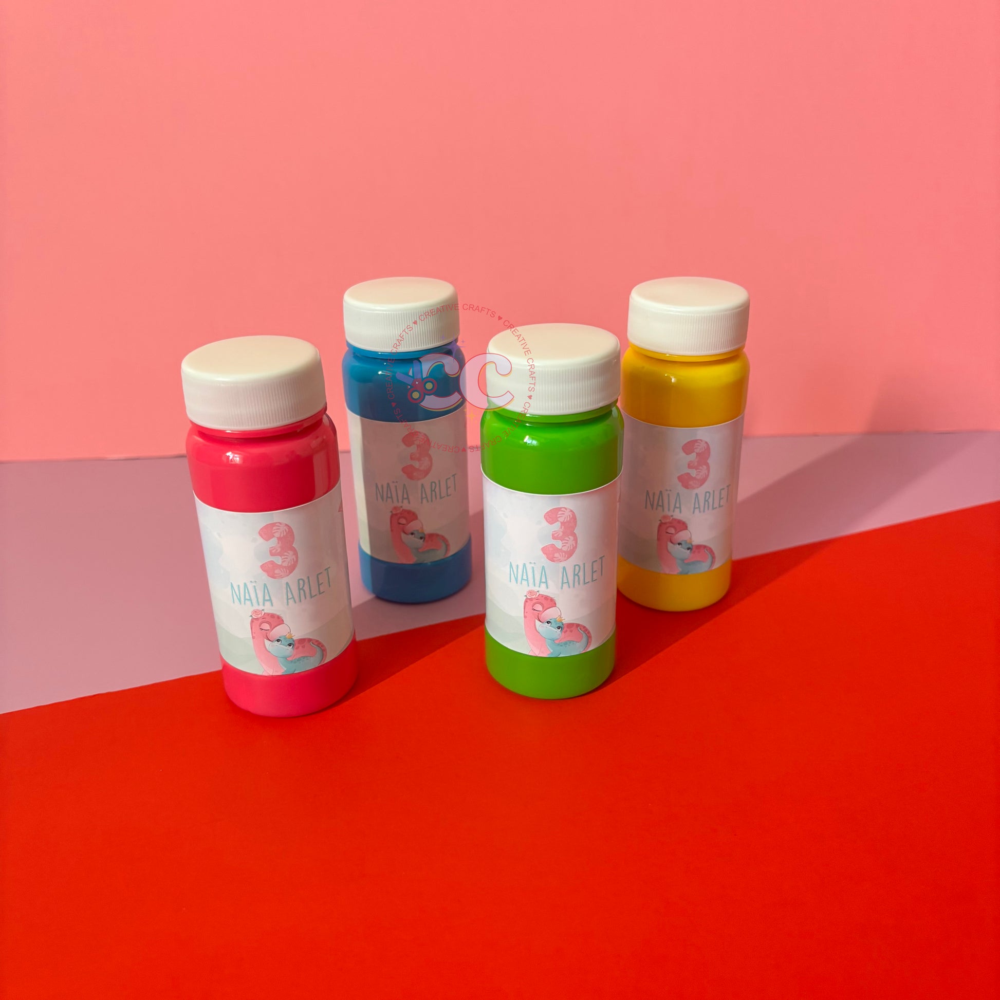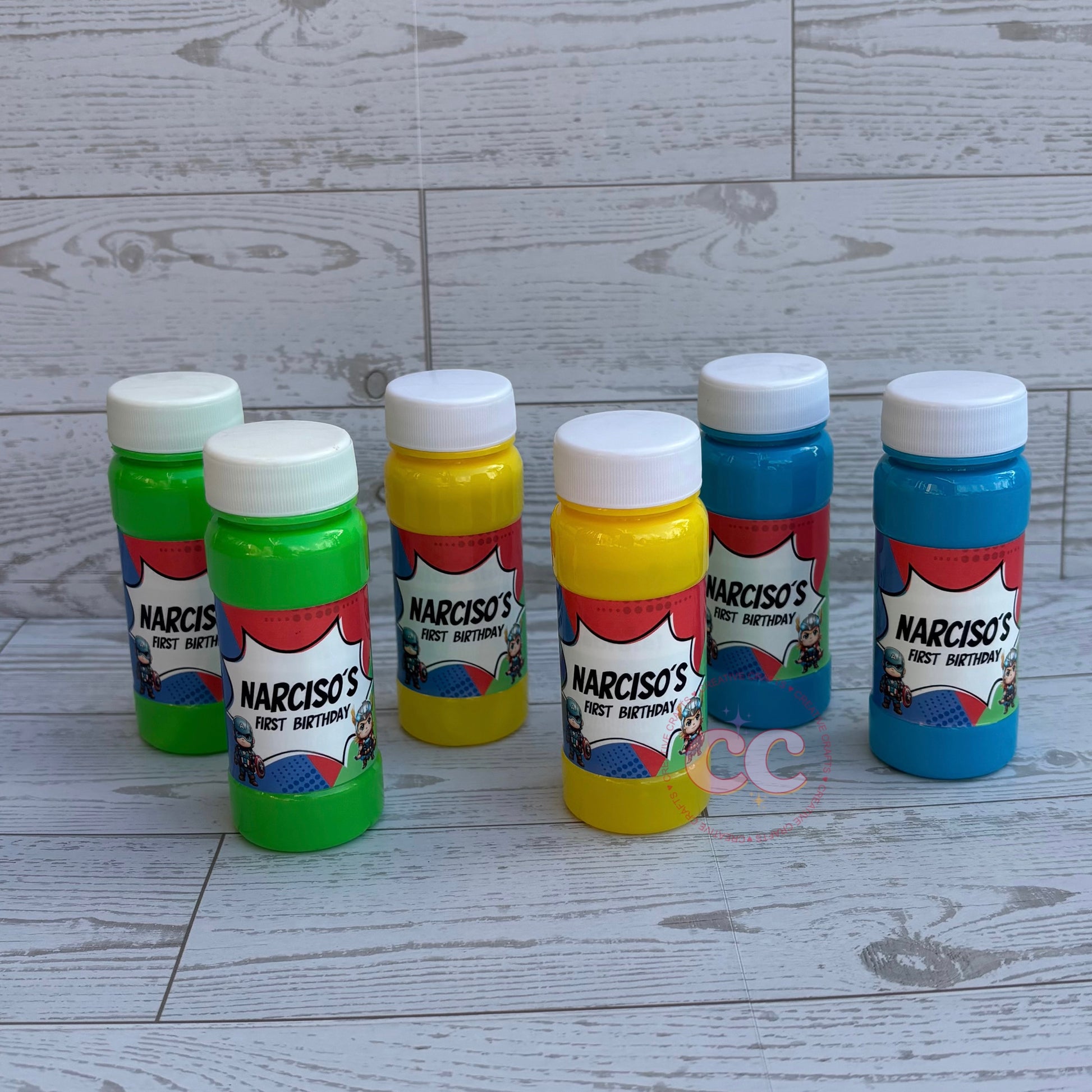 Burbujas en colores aleatoreos entre Azul, Amarillo, Verde y Rosa con label 100% personalizado de el tema de la fiesta con