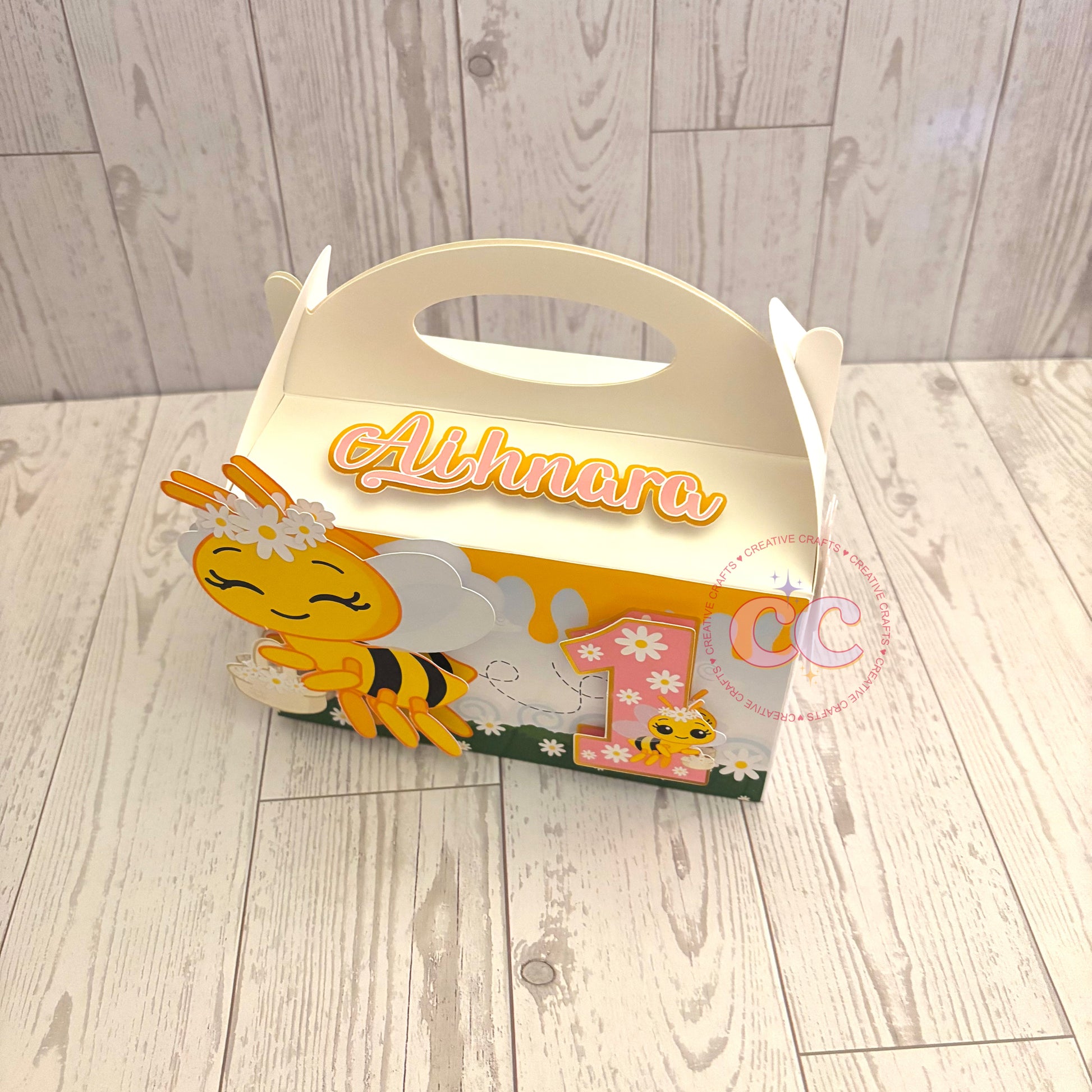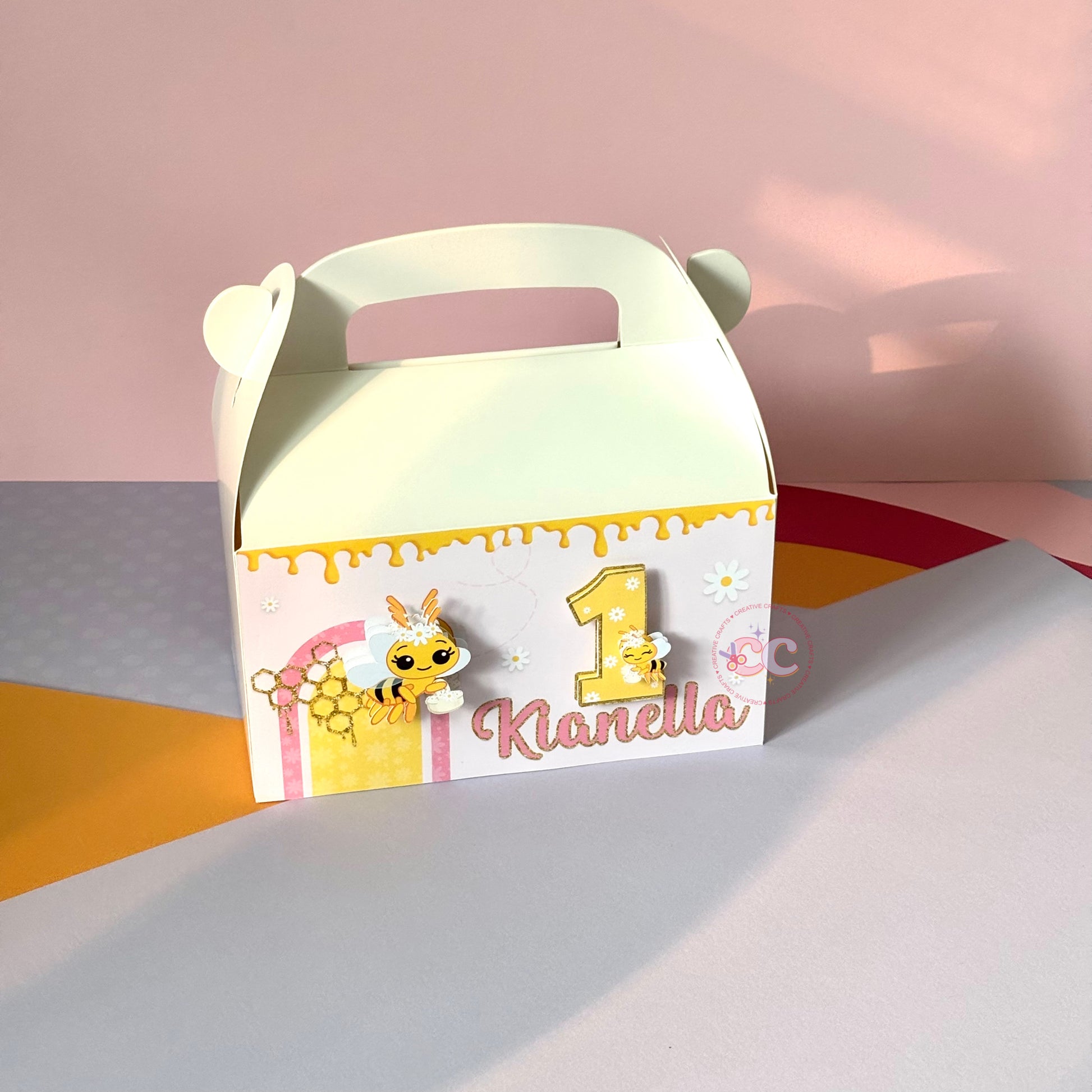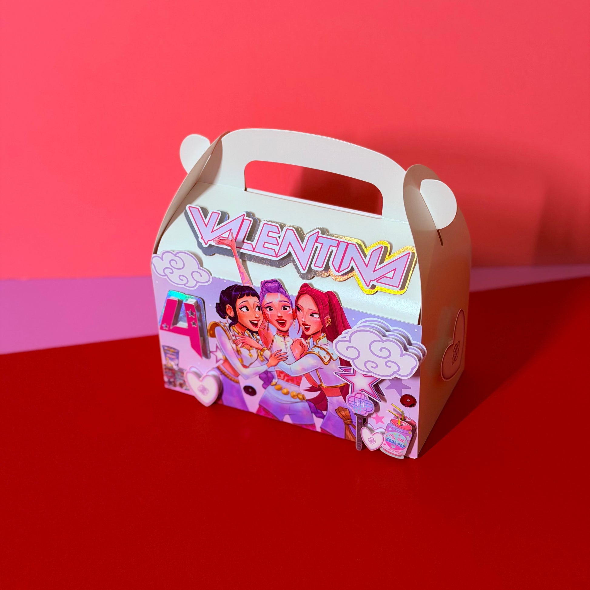 Caja color blanca con la parte delantera 100% personalizado con la temática de la fiesta, que incluye nombre, edad y colores. ESTA CAJITA TIENE EFECTO 3D!
