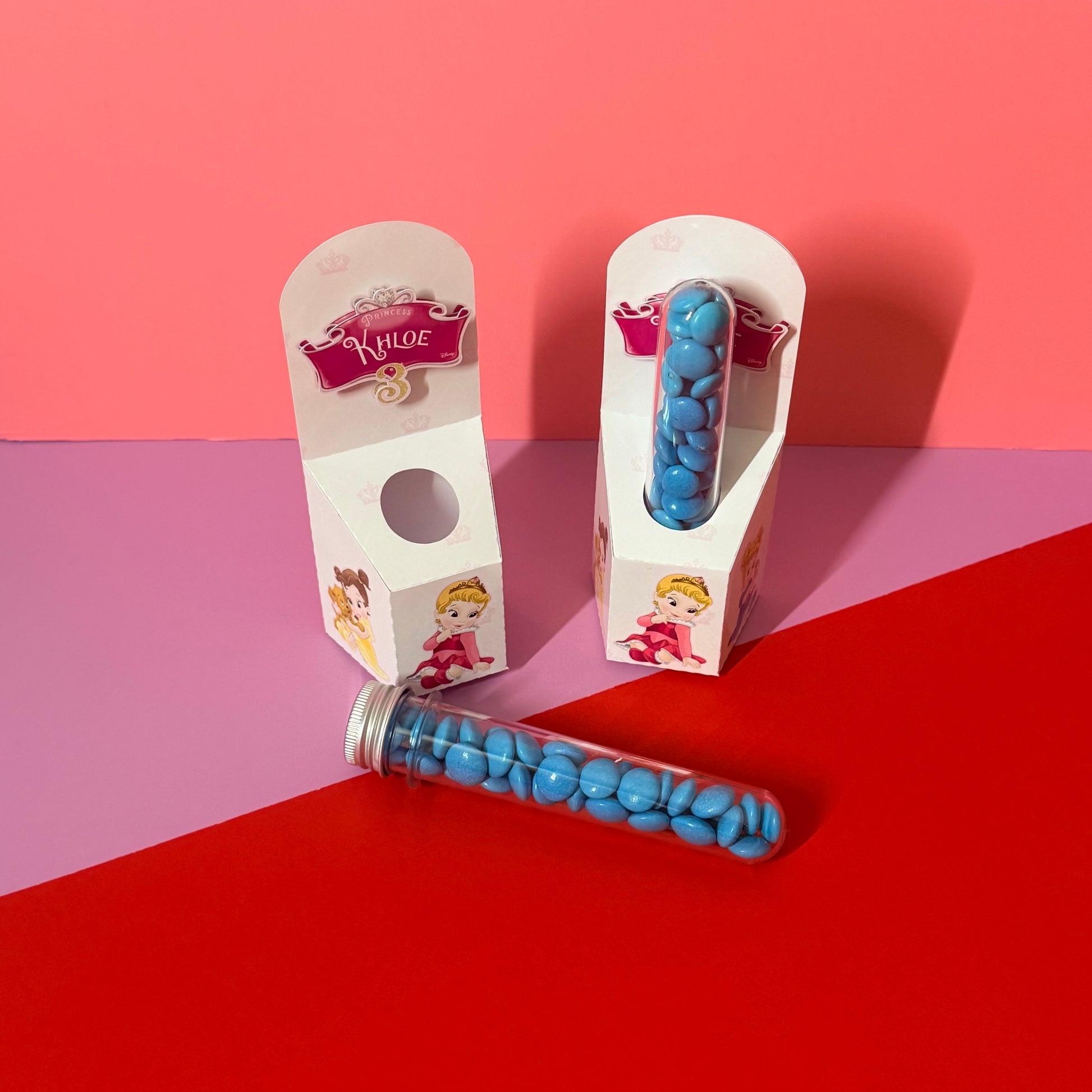 Tubos con su cajita 100% personalizadas con la temática de la fiesta, que incluye nombre, edad y colores. INCLUYE LOS M&M'S DE EL COLOR QUE VAYA DE ACUERDO AL TEMA.