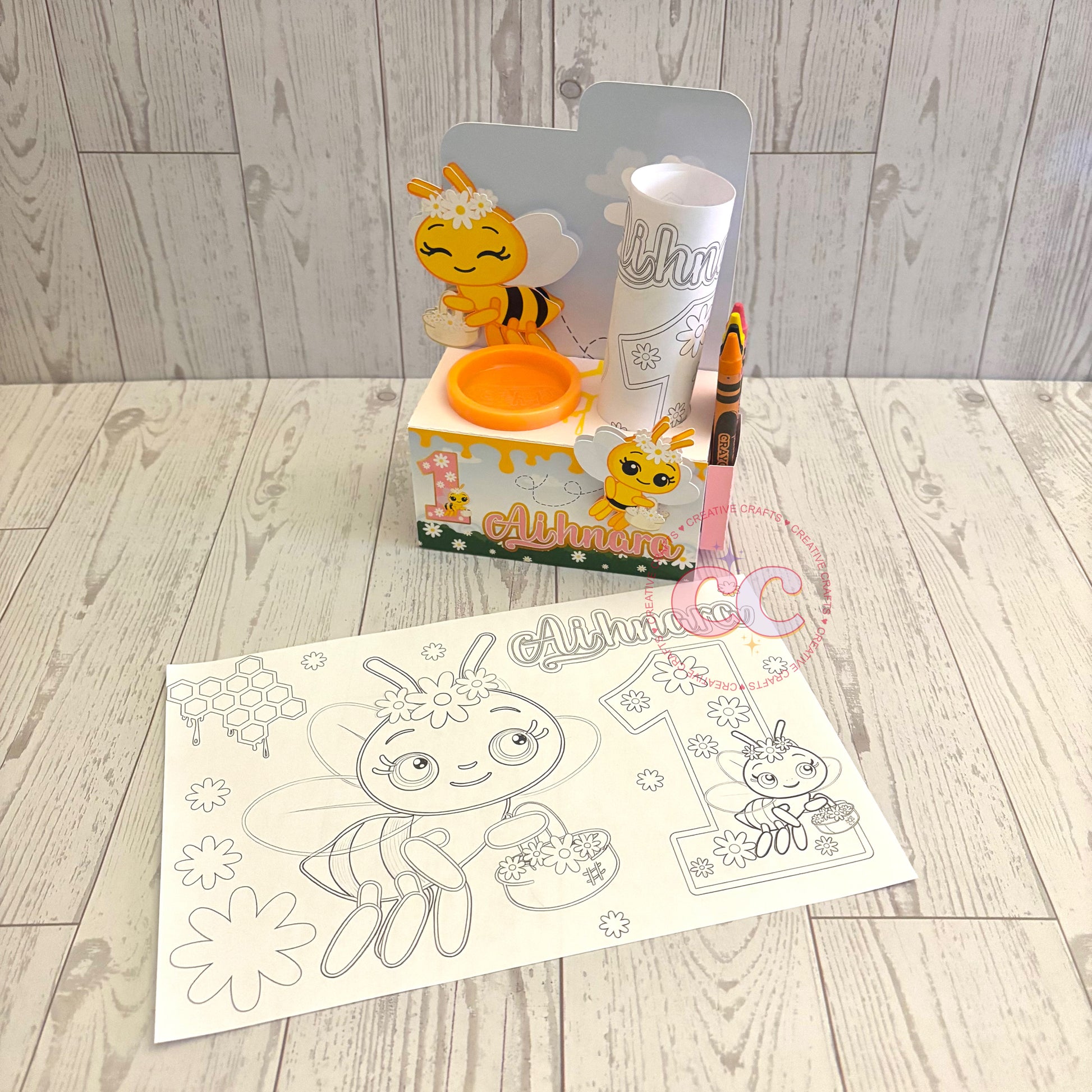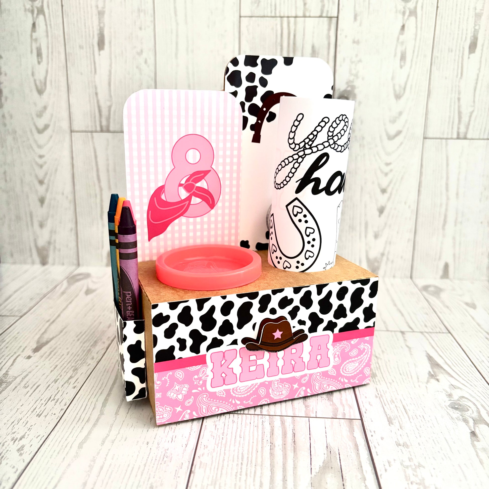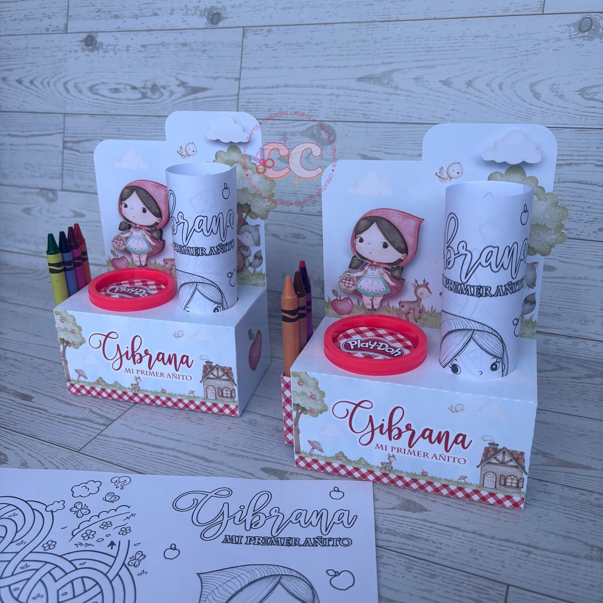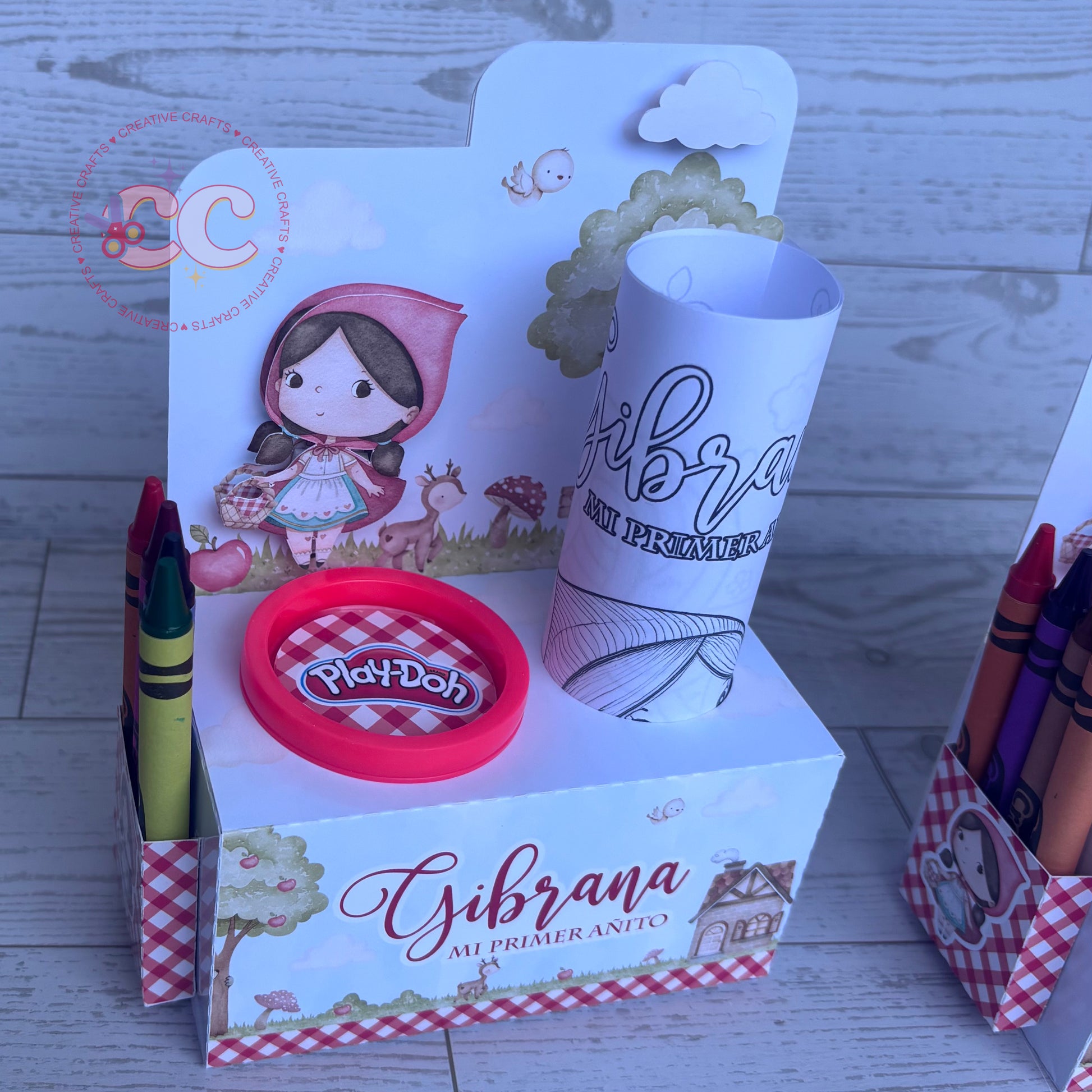 Cajita personalizada con el tema, nombre, edad y colores de su preferencia. Incluye Play-Doh, 2 Hojas de colorear personalizadas y 3 crayolas.